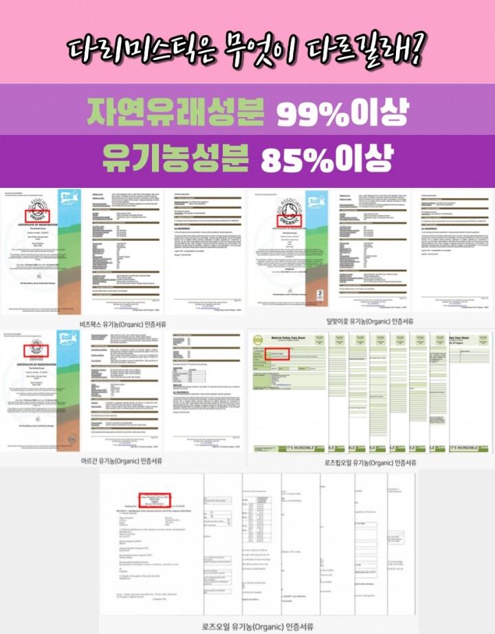 아르간 오일은 피부보습과 항산화작용이 뛰어납니다. 로즈오일은 모든 피부에 적합하며 안토시아닌 성분이 콜라겐 생성을 촉진시켜 피부의 신진대사 활성화 및 보습력유지를 통하여 피부미용 및 주름완화에 도움을 줍니다. 달맞이꽃 오일은 필수지방산과 리놀렌산을 많이 함유하여 보습이 뛰어나고 피부트러블 진정에 효과적입니다.