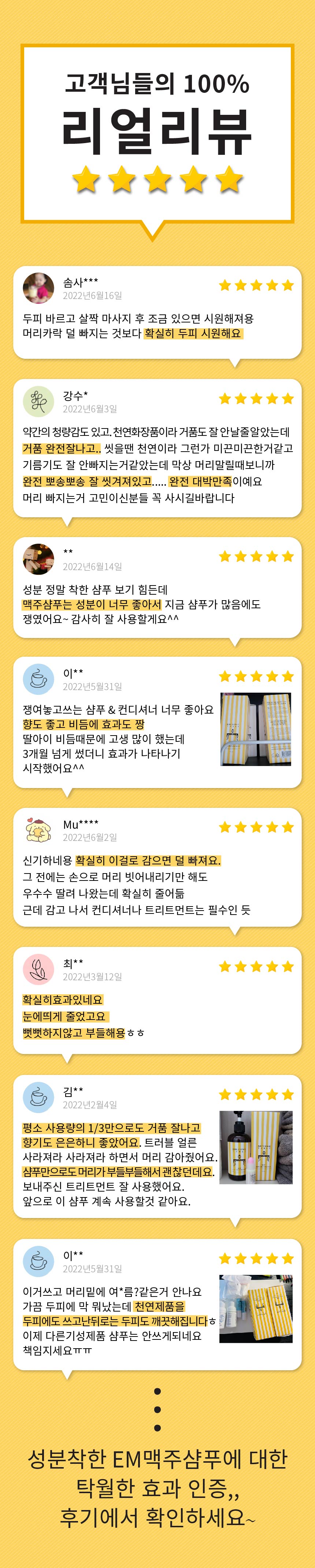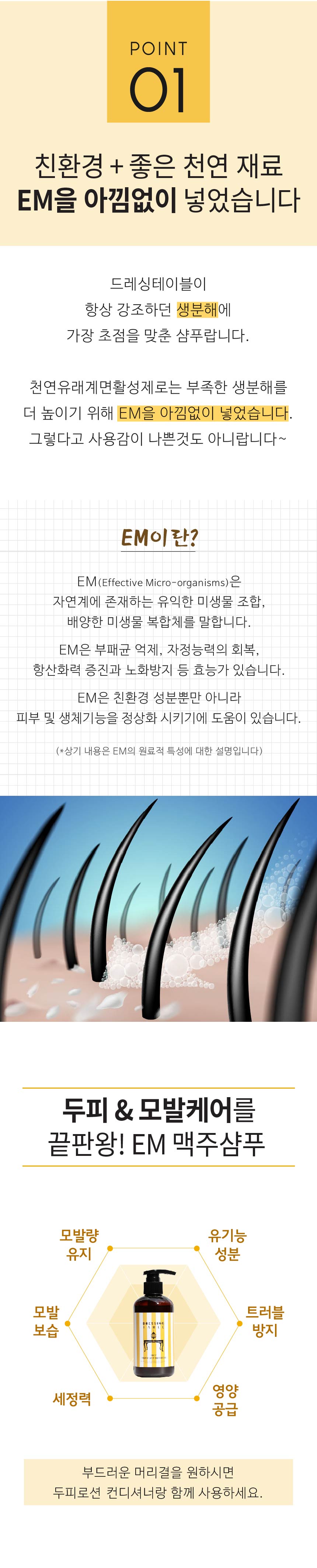 [EM맥주샴푸] 이엠원액(EM-1), 데실글루코사이드, 편백나무잎추출물, 소듐코코일글라이시네이트, 정제수, 맥주효모추출물, 케라틴, 판테놀, 베타인, 폴리쿼터늄10, 멘톨, 시트릭애씨드, 1,2-헥산디올, *로즈마리잎오일, *레몬껍질오일 (*=유기농원료)