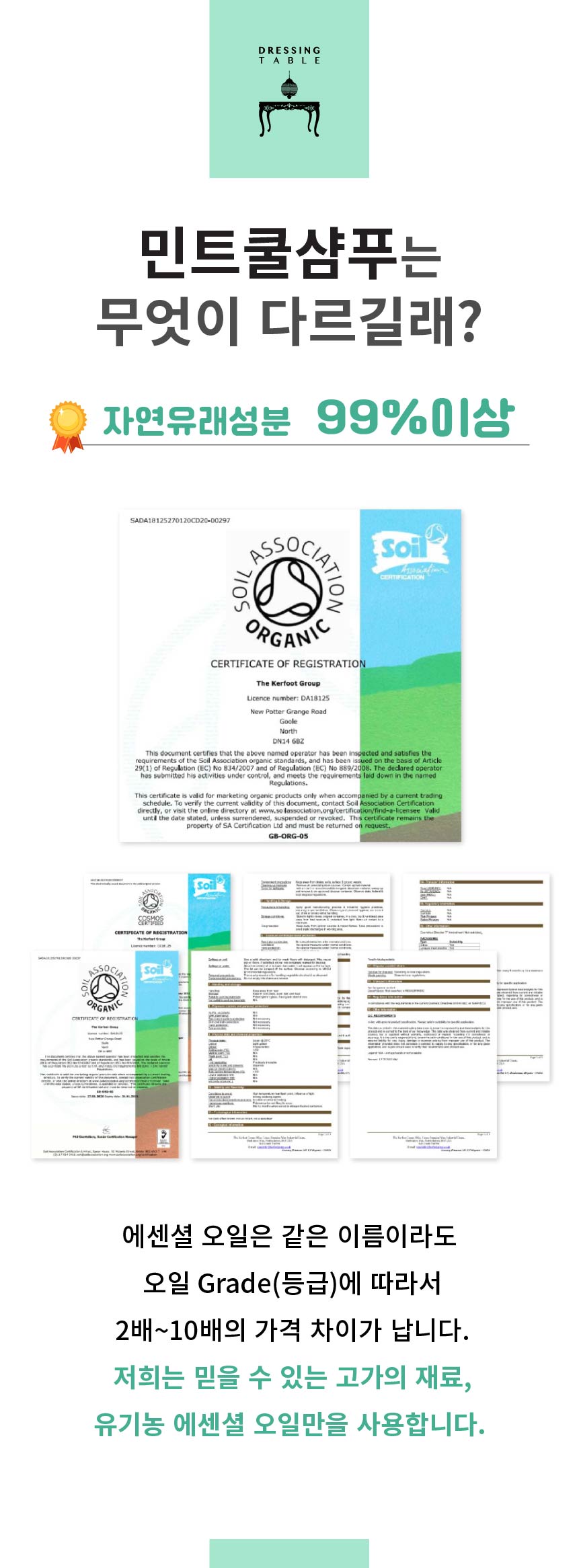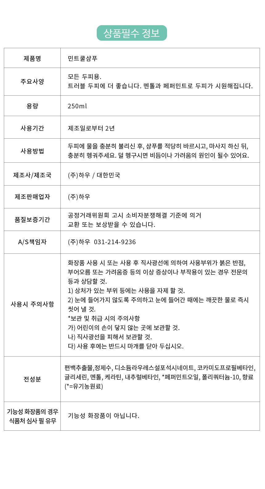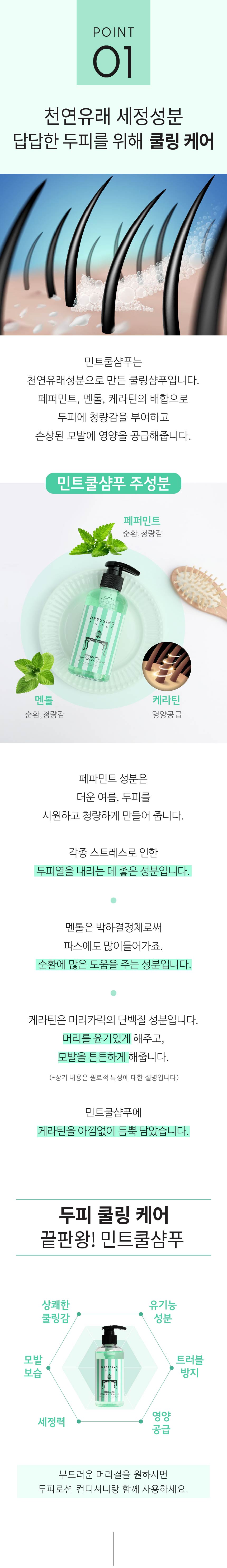 [민트쿨샴푸] 편백추출물,정제수, 디소듐라우레스설포석시네이트,코카미도프로필베타인,글리세린,멘톨,케라틴,내추럴베타인,*페퍼민트오일,폴리쿼터늄-10,향료 (*=유기농원료)