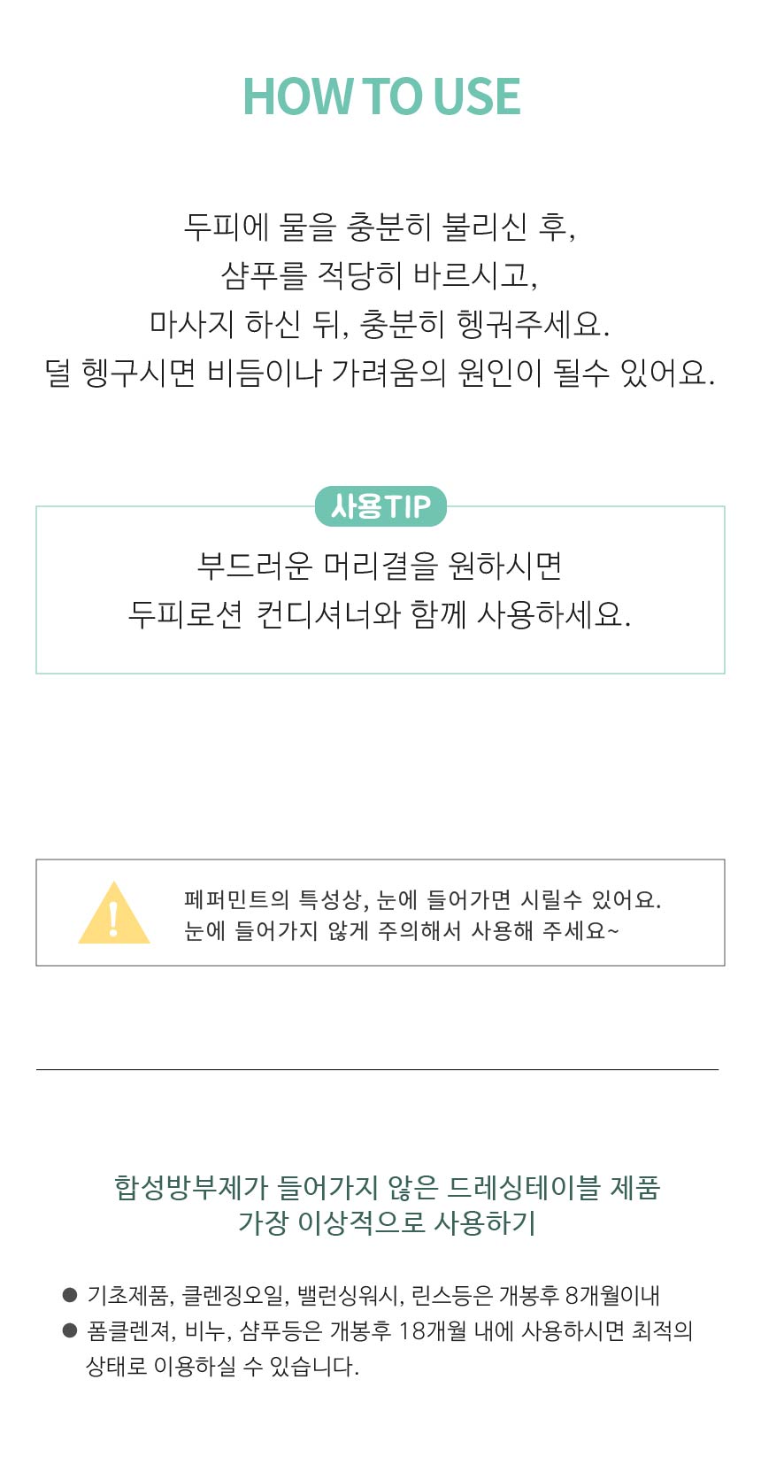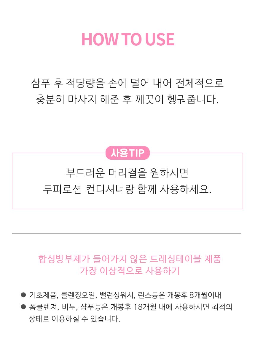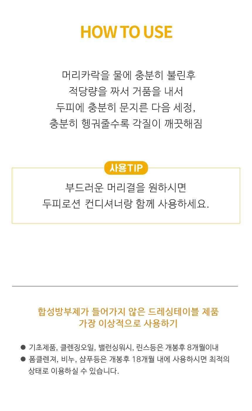 미온수로 두피와 모발을 충분히 적셔줍니다. 적당량을 손에 덜어 거품을 내서 전체적으로 마사지 하듯 샴푸해 줍니다. 거품이 사라질 때까지 충분히 헹궈 줍니다.샴푸 후 적당량을 손에 덜어 내어 전체적으로 충분히 마사지 해준 후 깨끗이 헹궈줍니다.