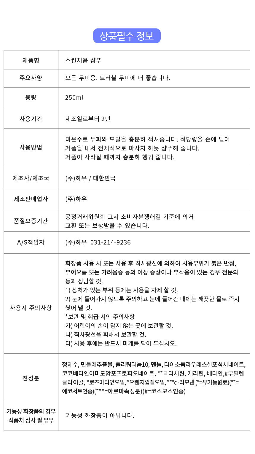 [스킨처음 샴푸] 정제수,민들레추출물,디소듐라우레스설포석시네이트,코카미도프로필베타인,글리세린,멘톨,케라틴,*베타인,*로즈마리잎오일,*오렌지껍질오일,향료 (*=유기농인증)