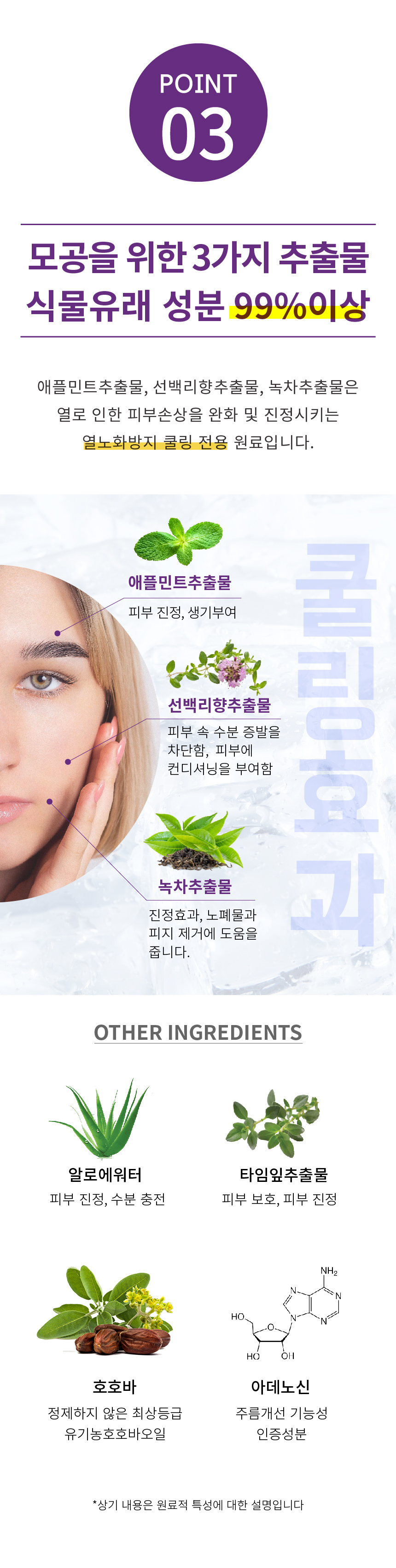 알로에베라잎즙,*호호바오일,트라이올레인,소듐하이알루로네이트,판테놀,애플민트잎추출물,타임잎추출물,녹차추출물,토코페롤,알로에베라잎즙가루,카보머,12-헥산디올,라이신,히스티딘,알지닌,아스파틱애씨드,트레오닌,세린,글루타믹애씨드,프롤린,글라이신,알라닌,발린,메티오닌,아이소류신,류신,티로신,페닐알라닌,시스테인,락토바실러스발효물,강황추출물,부틸렌글라이콜,폴리솔베이트80,아데노신,프로판다이올,정제수,**1,3-프로판디올,**펜틸렌글라이콜,**글리세릴카프릴레이트,블루탄지꽃오일,*자몽껍질오일,d-리모넨(*=유기농원료)(**=에코서트인증)