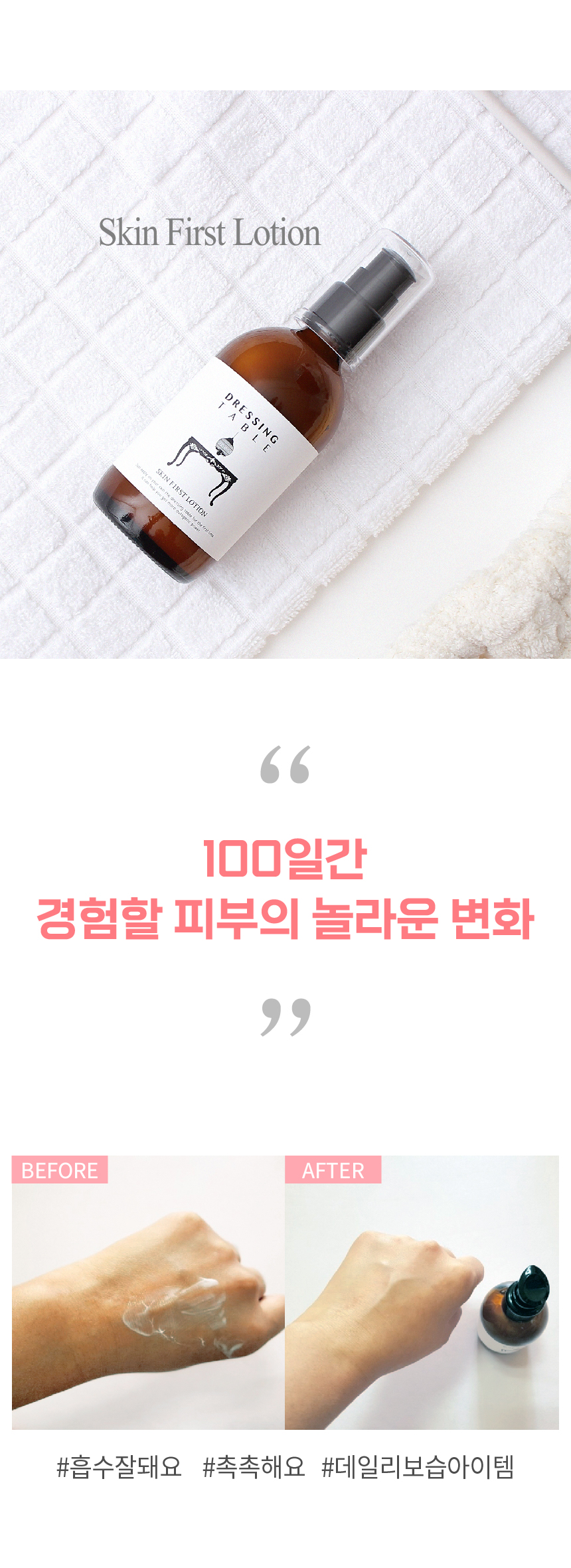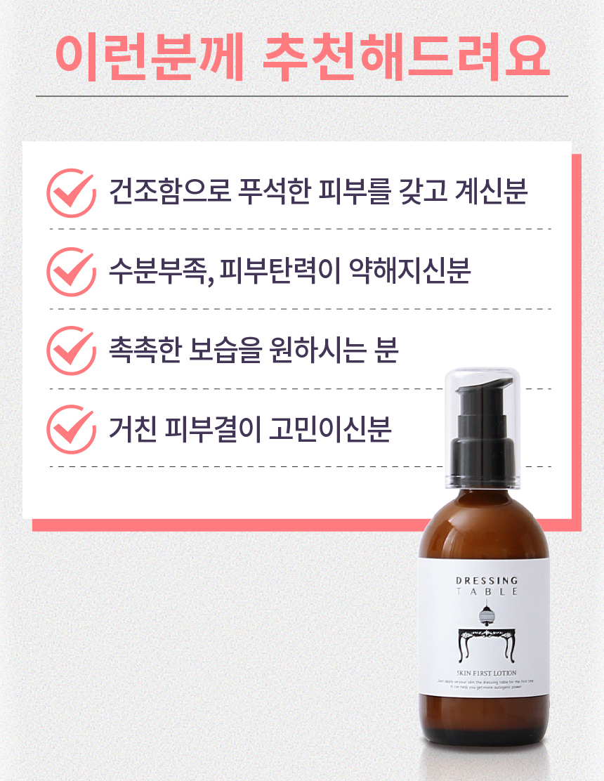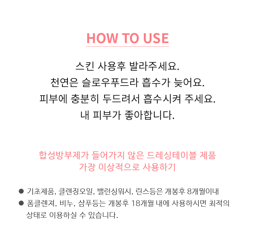 스킨 사용후 발라주세요. 천연은 슬로우푸드라 흡수가 늦어요. 피부에 충분히 두드려서 흡수시켜 주세요. 내 피부가 좋아합니다.