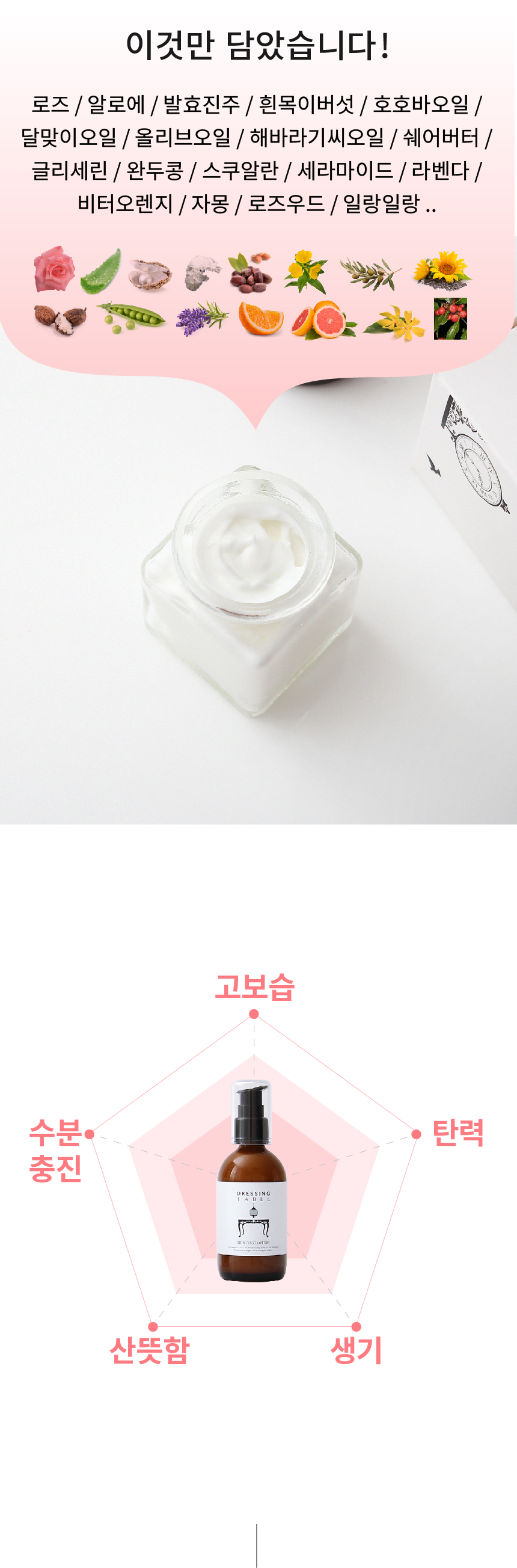 장미꽃추출물,알로에베라잎즙,흰목이버섯추출물,효모/진주층발효용해여과물,*호호바씨오일,*달맞이꽃오일,*올리브오일,*해바라기씨오일,*쉐어버터,세테아릴올리베이트,소르비탄올리베이트,세테아릴알코올,세테아릴글루코사이드,글리세린,토코페롤,알로에베라잎즙가루,카보머,13비지,알지닌,정제수,프로판디올,정제수,하이드롤라이즈드완두콩단백질,피토스테롤,레시틴,스쿠알란,세라마이드3,12-헥산디올,*라벤더꽃오일,*비터오렌지꽃오일,*오렌지껍질오일,*자몽껍질오일,*로즈우드오일,*일랑일랑꽃오일 (*=유기농원료)