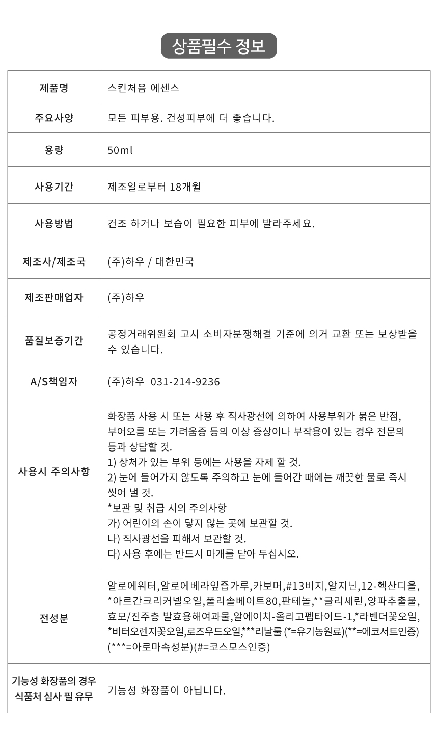 1. 화장품을 사용하여 다음과 같은 이상이 있는 경우에는 사용을 중지해야 하며, 계속 사용하면 증상이 악화되므로 피부과 전문의 등에게 상담할 것 가) 사용 중 붉은 반점, 부어오름, 가려움증, 자극등의 이상이 있는 경우 나) 적용 부위가 직사광선에 의하여 같은 이상이 있는 경우 2. 상처가 있는 부위, 습진 및 피부염 등의 이상이 있는 부위에는 사용을 하지 말 것 3. 보관 및 취급시의 주의사항 가) 사용 후에는 반드시 마개를 닫아둘 것 나) 유아.소아의 손이 닿지 않는 곳에 보관할 것 다) 고온 또는 저온의 장소 및 직사광선이 있는 곳에는 보관하지 말 것