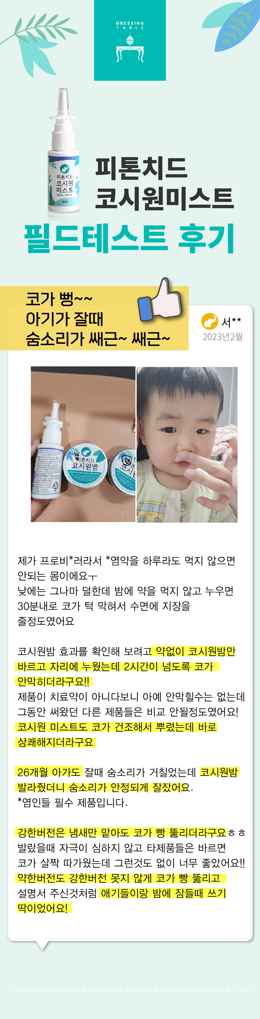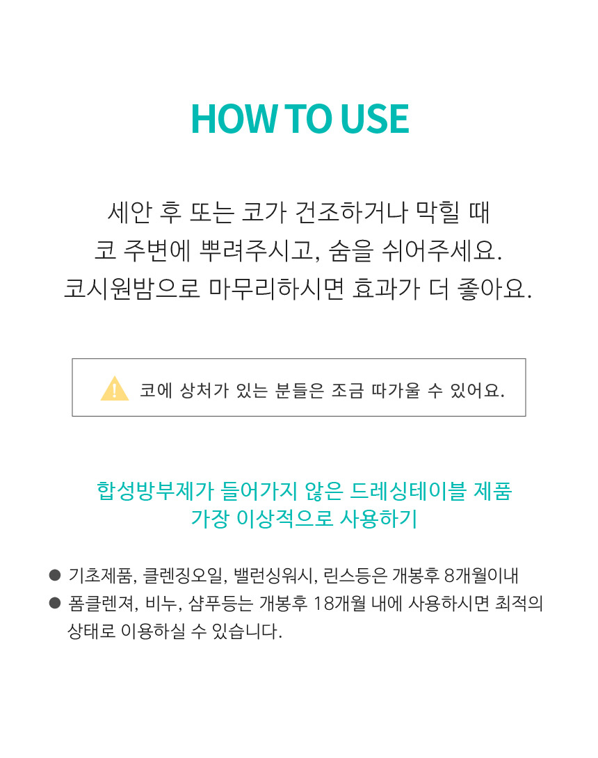 세안 후, 또는 코가 건조하거나 막힐 때 코 주변에 뿌려주시고, 숨을 쉬어주세요. 코시원밤으로 마무리하시면 효과가 더 좋아요.