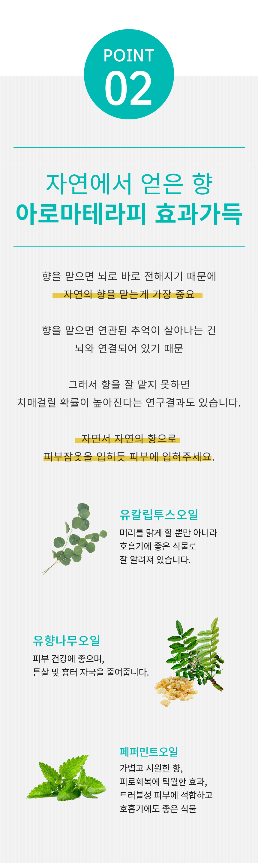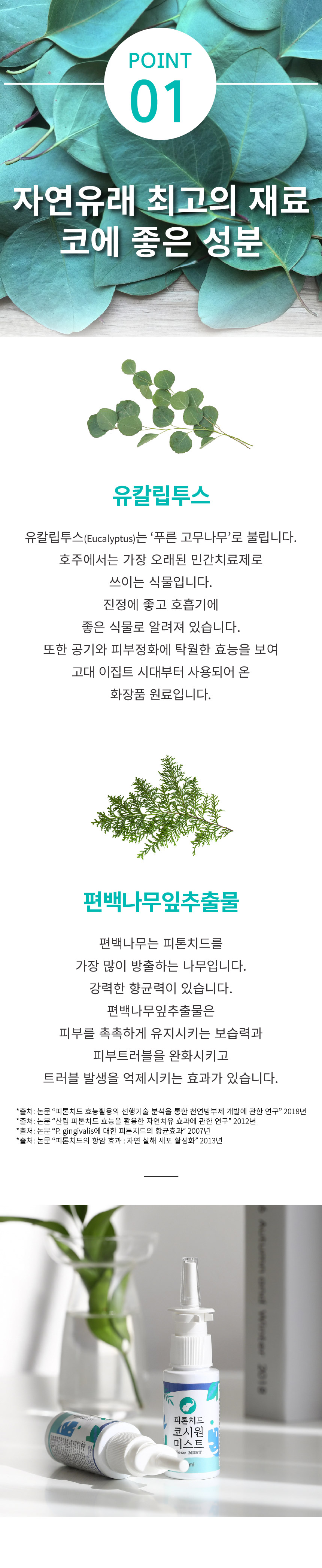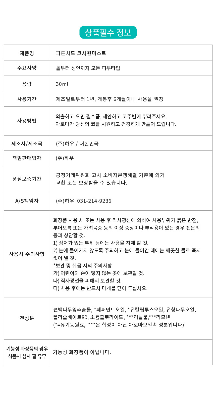 편백나무잎추출물, *페퍼민트오일, *유칼립투스오일, 유향나무오일, 폴리솔베이트80,소듐클로라이드, ***리날룰,***리모넨(*=유기농원료) ***은 합성이 아닌 아로마오일속 성분입니다.